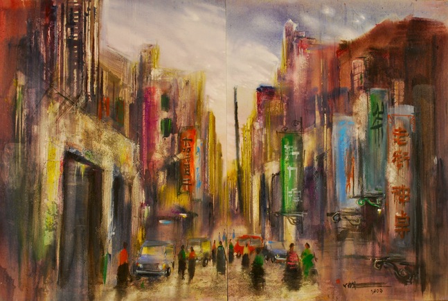 写画地点: 台湾桃园.大溪媒材规格:硅酸钙板、厚工水彩第57届中部美展( 2010全国征件)水彩类-入选奖描写晨光初洒,乡间街道搔动,晨作人们穿梭在车阵中。黄紫互补色在透明与不透明水彩间流动,在写实与写意间揭开晨光序曲。