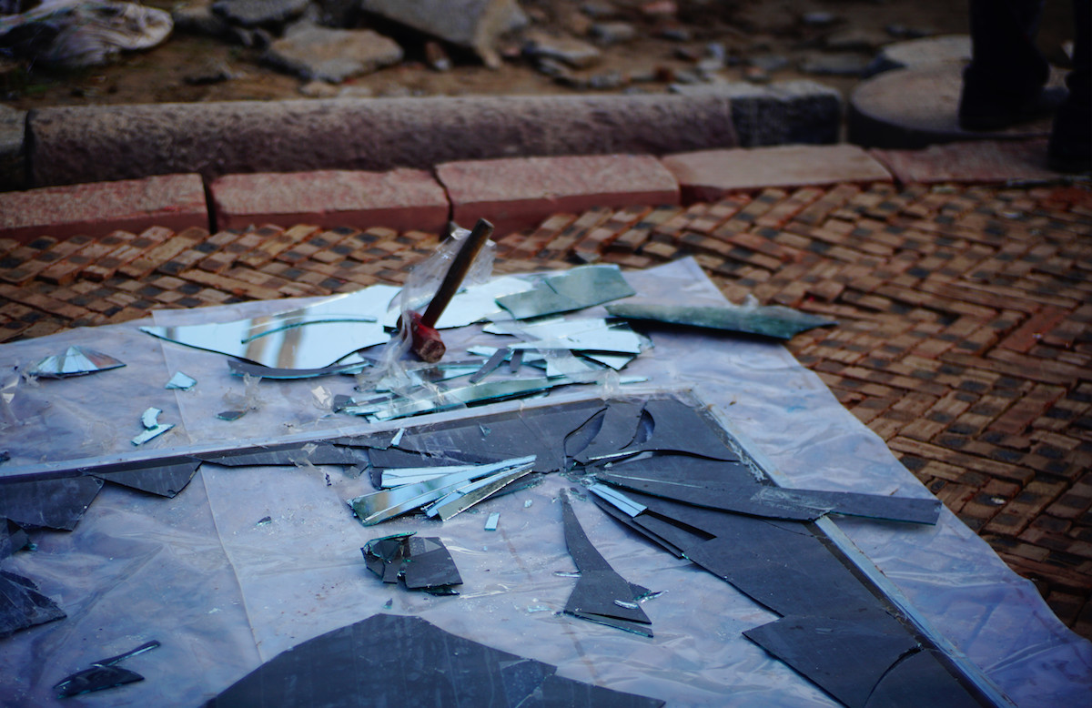 从村民家搞来了一大块闲置的镜子,然后砸碎。