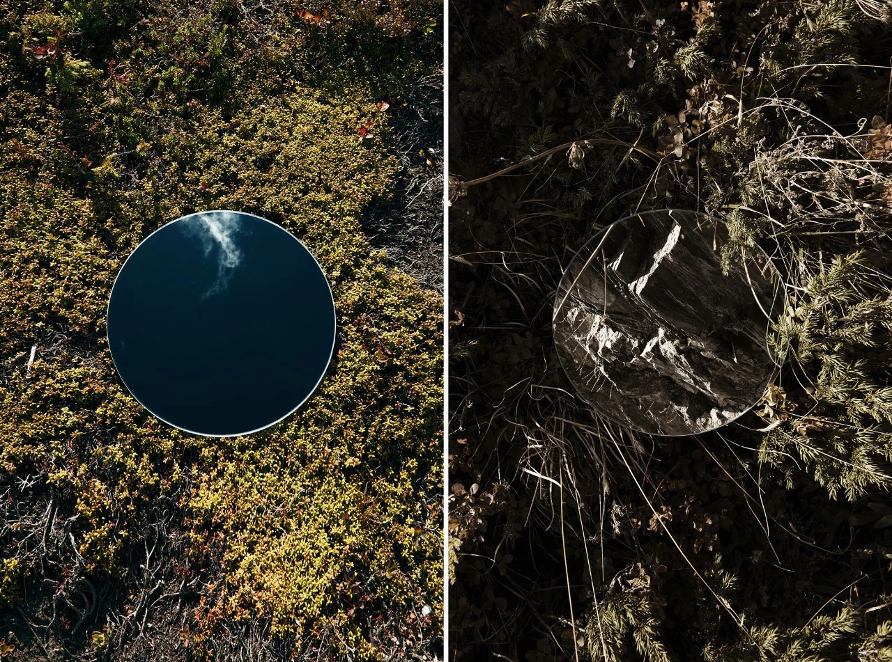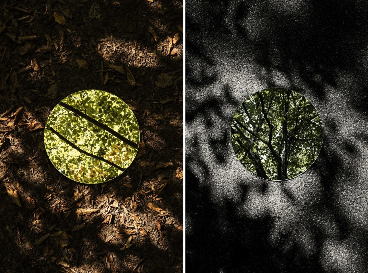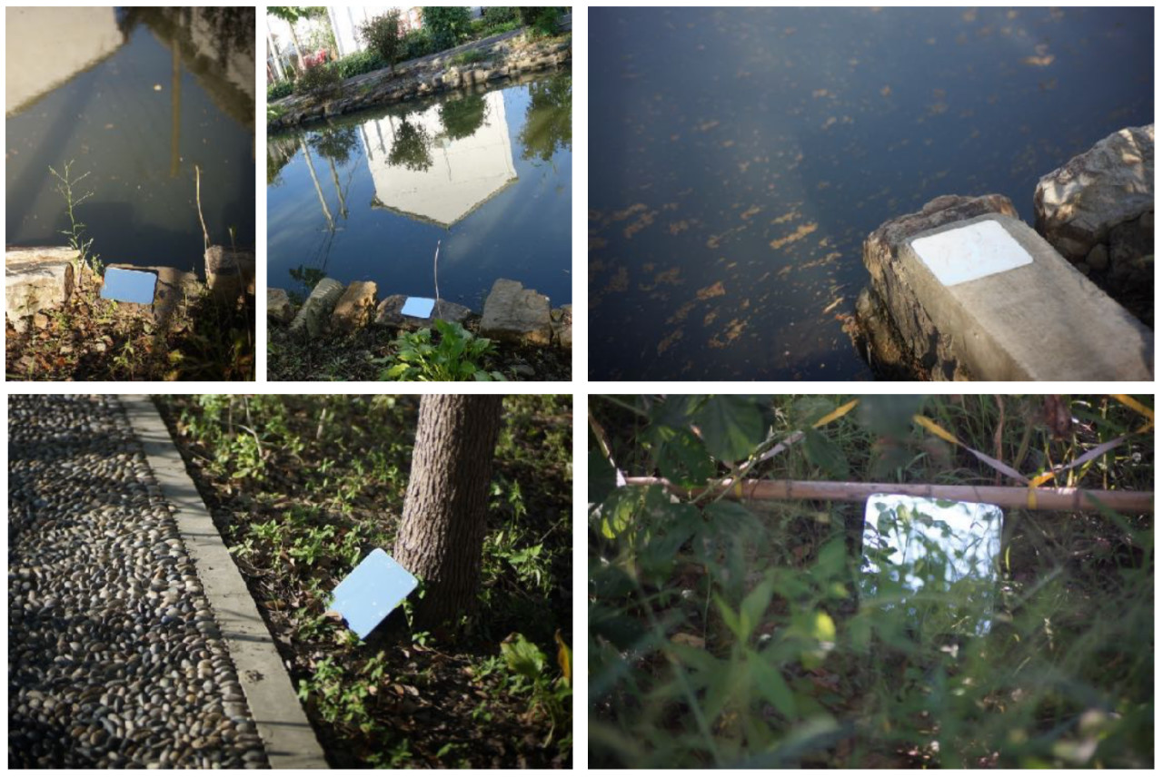 利用一面圆镜圆形镜子,放置在户外,