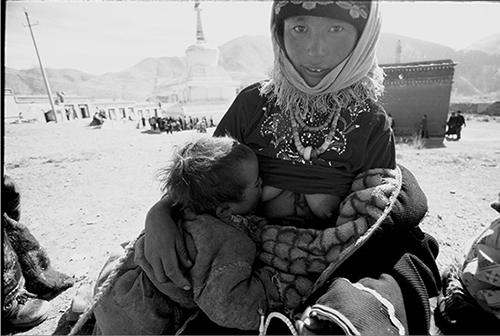 施政最喜欢拿来说事儿的一张照片是他用16毫米广角镜和胶片拍的,边框还隐约在,没裁割过。照片里一位母亲正面对着镜头,孩子凑在她胸前吃奶,虽然袒胸露乳,而且据施政说,其实他离她不过一臂距离,但这位母亲没有不安也没有惊恐,她是看着镜头的,但就好像镜头是不存在的。怎么做到的?施政说,拍照片就要放弃自己的目的。在拍摄之前,施政已经跟这一家人相处了大半天。我就是跑得累了,坐在那里休息,他们一家人也在休息,我就和小孩子玩。不远处有小卖部,坐得久,饿了,就喊小孩子过来,去帮我到小卖部买饼干,买来跟他们分着吃,渴了去买几瓶水,和他们分着喝,这样大半天下来,人家对我真的一点戒心也没有了。这是一个玩的过程,起初的目的并不是拍照。拍照片是一个交流的过程,只想到你要拍的内容,这是不对的。