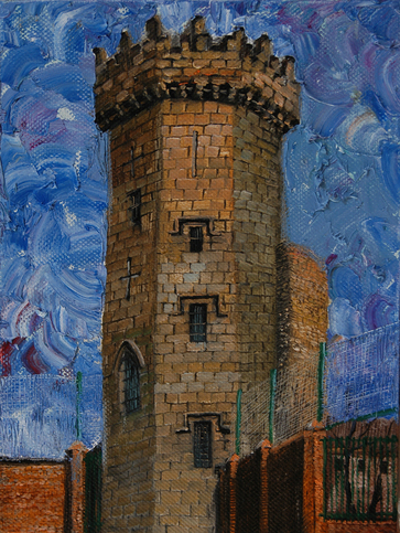 这幅油画以塔楼为描绘对象,黄色的塔楼、红色的砖墙形成一个围合的空间,天空中布满青色与蓝色。作品主要表达塔楼与天空、围墙内外空间的融合与对比,这些景观是人们非常熟悉的,但其实又充满陌生感。该幅作品曾参加“帘-海峡两岸艺术交流展”。