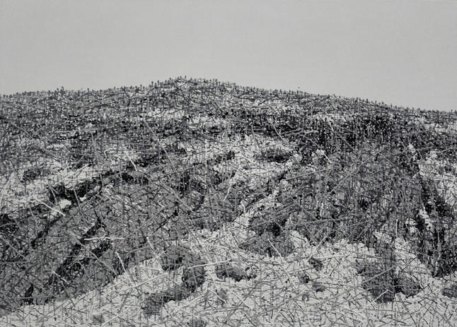 这是一个系列的作品中的第一幅,第一幅往往会有点舍不得,然而拿出来是为了寻找心灵相通,这比放在家里面更重要。这样的作品会有我最初的感受和最纯真的情感在里边。这样一幅没有一点点彩色的画面就好像舞台剧里面的哑剧一样只通过肢体语言来表达思想情感,一说话就破了。真的不忍心往里面添上一点彩色,无从下笔、不敢下笔。当我在面对海螺沟茫茫雪原时突然就语塞了,它传递给我的是一种不屈和力量,深灰色的坚硬的石头傲然伫立在雪地里好像在告诉我:“没有什么会让我屈服”,它说出了我的心声。