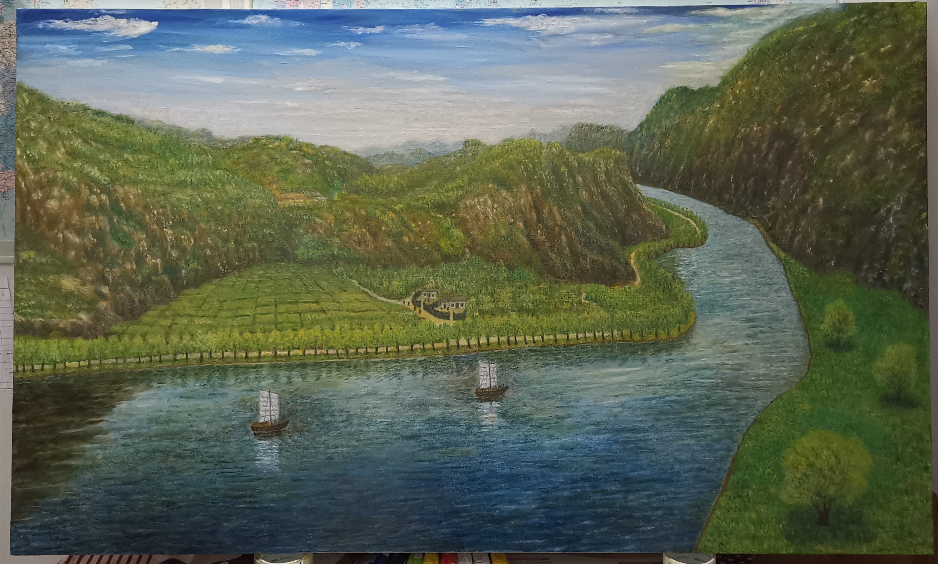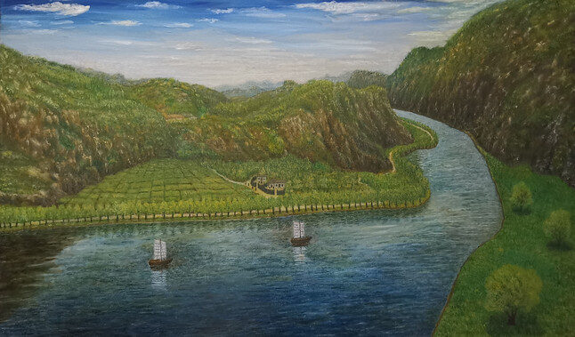 愿我的原创绘画给您带来愉悦健康和思想!在美丽的山河中居住或者旅游常常使人感慨自然界的伟大,不加任何雕琢就能给人带来巨大的美感,要想留住这种美感,只有珍惜和保护这种美丽的自然环境!此画是按中国古代风水学原理和美学原理以及健身养生学原理创作的,有一定的健身养生作用,常看此画可使人心旷神怡健康长寿!此种画法是我独创,世界唯一,希望您看过不要错过!